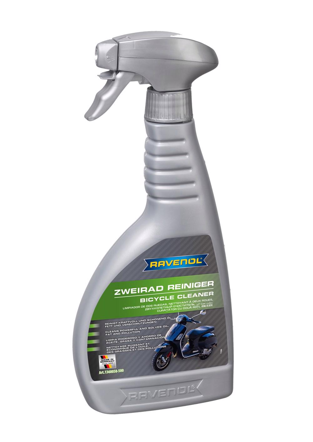 RAVENOL Zweirad-Reiniger indeparteaza fara probleme murdaria precum praf, ulei, unsoare, de pe aparatoarele de plastic, lantul de franare, etc. Este foarte eficient datorita cantitatii mici necesare pentru a curata o suprafata. Nu dizolva lipiciul sau lacul. Nu contine deloc formaldehida si fostat. Este biodegradabil in proportie de 98%.
