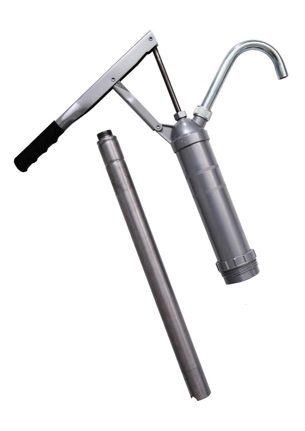 Pompa cu cilindru si parghie din metal, teava de aspiratie telescopica si cot de evacuare.