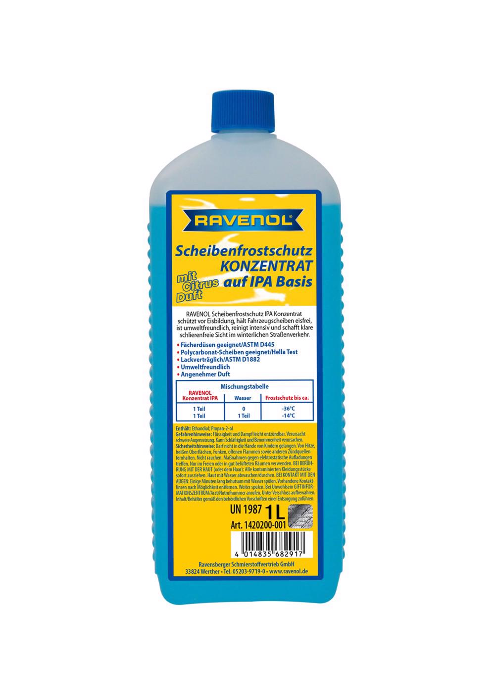 RAVENOL Scheibenfrostschutz IPA Konzentrat -solutie concentrata de parbriz pentru sezonul rece . Protejeaza parbrizul de inghet , curata si ofera vizibilitate crescuta in sezonul rece. Poate fi amestecat cu apa in urmatoarele proportii :