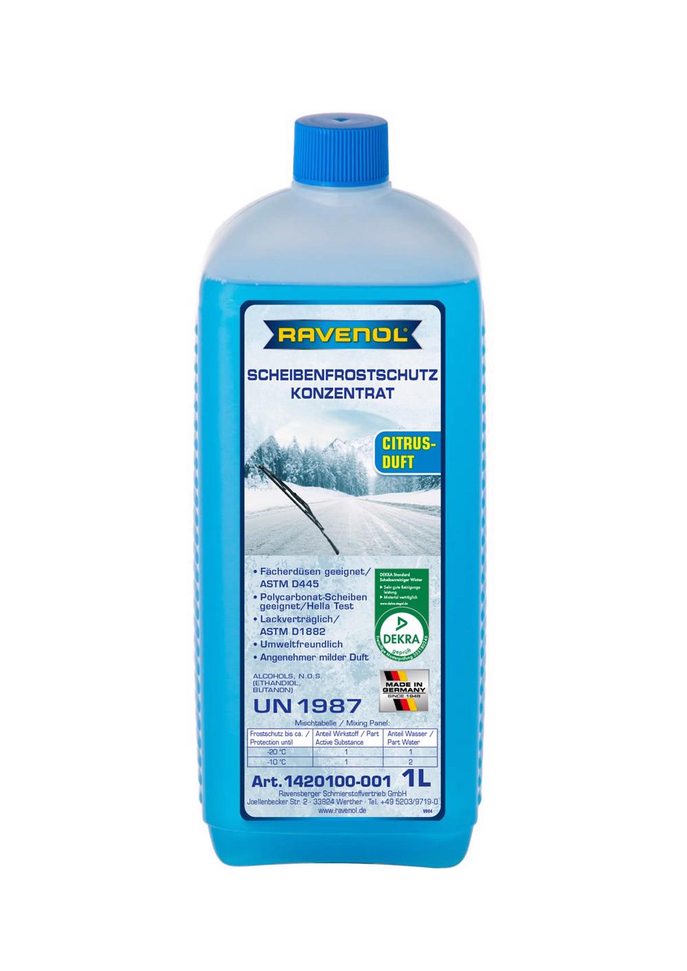 RAVENOL Scheibenfrostschutz Konzentrat este o solutie de parbriz concentrata impotriva inghetarii, cu un parfum placut de citrice, bazat pe alcooli bio. Protejeaza impotriva formarii de gheata, mentine parbrizul fara gheata, este prietenos cu mediul, curata intensiv si ofera o vedere clara prin parbriz in lunile de iarna. RAVENOL Scheibenfrostschutz Konzentrat indeplineste cerintele testului DEKRA si a primit sigiliul DEKRA. RAVENOL Scheibenfrostschutz Konzentrat se dilueaza cu apa. Raport de amestec: - 1 parte apa, 1 parte solutie concentrata: Ofera protectie antiinghet la temperaturi de maxim -20°C - 2 parti apa, 1 parte solutie concentrata: Ofera protectie antiinghet la temperaturi de maxim -10°C