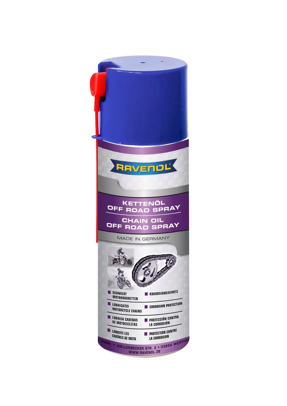 RAVENOL Spray cu Vaselina pentru Off-Road este un produs destinat lubrifierii lanturilor motocicletelor, motocicletelor off-road si ATV-urilor si a oricaror alte echipamente a caror distributie a miscarii implica/necesita existenta unor lanturi neprotejate sau expuse direct murdariei, intemperiilor, variatiilor mari de temperatura precum si a socurilor mecanice, termice sau de alta natura. Descriere: RAVENOL Spray cu Vaselina pentru Off-Road este un lubrifiant special dezvoltat pentru lubrifierea lanturilor aflate sub incarcaturi extreme specifice motocicletelor off-road, ATV-urilor si a lanturilor neprotejate. RAVENOL Spray cu Vaselina pentru Off-Road este potrivit pentru lanturi cu sau fara etansari inelare si este recomandat pentru lanturile O si X rings RAVENOL Spray cu Vaselina pentru Off-Road se preteaza pt off-road deoarece prin aplicarea acestui produs, murdaria (noroiul, mocirla) se va desprinde cu usurinta de pe lanturi, role, pinioane si va fi eliminata datorita vitezei centrifuge mari specifice acestor echipamente. RAVENOL Spray cu Vaselina pentru Off-Road este hidrofug si are o protectie ridicata impotriva coroziunii Datorita cantitatii ridicate de PTFE existente in acest produs se asigura o etansare/protectie foarte buna a suprafetelor pe care a fost aplicat Instructiuni de aplicare: Agitati produsul inainte de utilizare. Suprafetele trebuie sa fie bine uscate, fara praf si fara grasimi, iar pentru obtinerea acestui status se va utiliza produsul Ravenol Spray de curatare lanturi. Aplicati fin RAVENOL Spray cu Vaselina pentru Off-Road , lasati sa actioneze cateva minute si aplicati fin iarasi. Lasati sa se usuce bine inainte de a incepe sa exploatati/sa porniti echipamentul astfel protejat. Caracteristicitehnice: