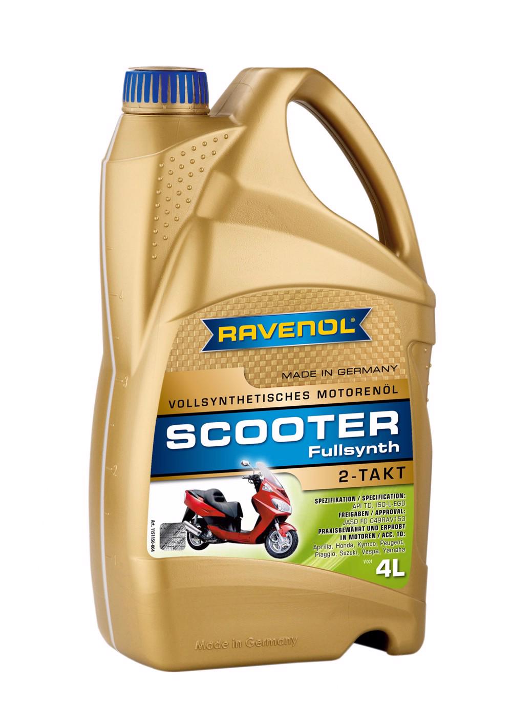 RAVENOL SCOOTER 2-Takt Fullsynth. este un ulei integral sintetic, de inalta calitate, pentru motoarele in 2 timpi. Contine poliolester cu esteri speciali si poliizobutilena (PIB) pentru protectie optima impotriva uzurii si pentru prevenirea coroziunii, depunerilor si auto-aprinderilor, chiar si in conditii extreme. Este optimizat pentru motoarele in 2 timpi ale scuterelor cu sistem de racire cu apa sau aer. Potrivit pentru sistemele de lubrifiere separate sau mixte. RAVENOL SCOOTER 2-Takt Fullsynth. poate fi amestecat cu benzina normala in raport de 1:100.